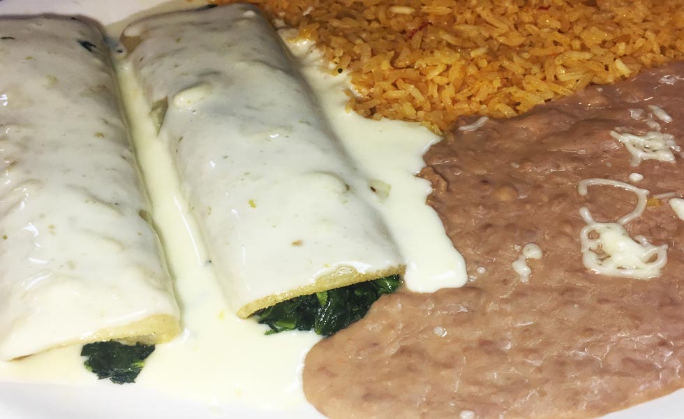 C. Two spinach enchiladas topped with melted cheese, rice and beans